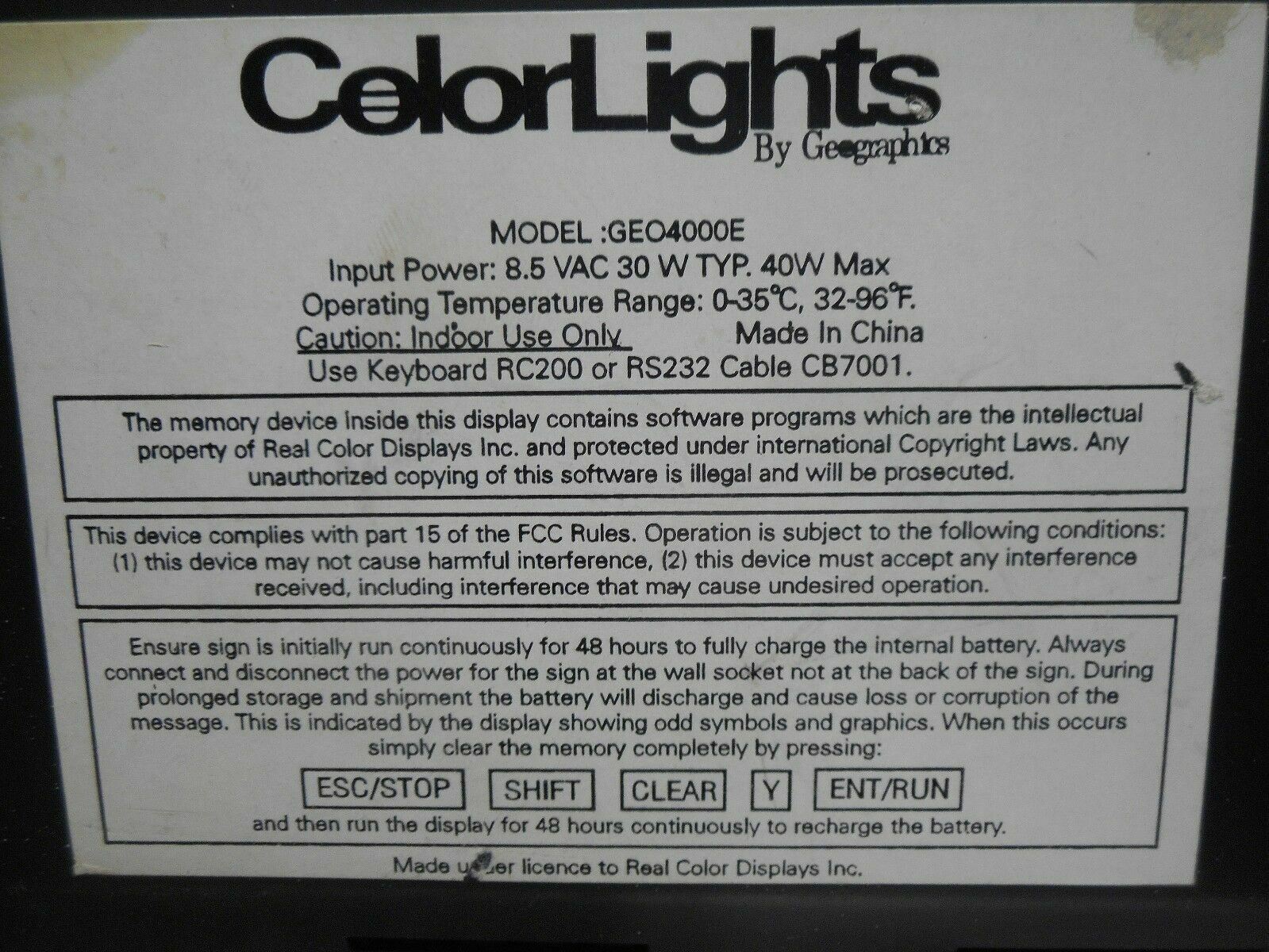 ColorLights By Geographics GEO4000E LED Moving Message Sign 37" Screen Warranty